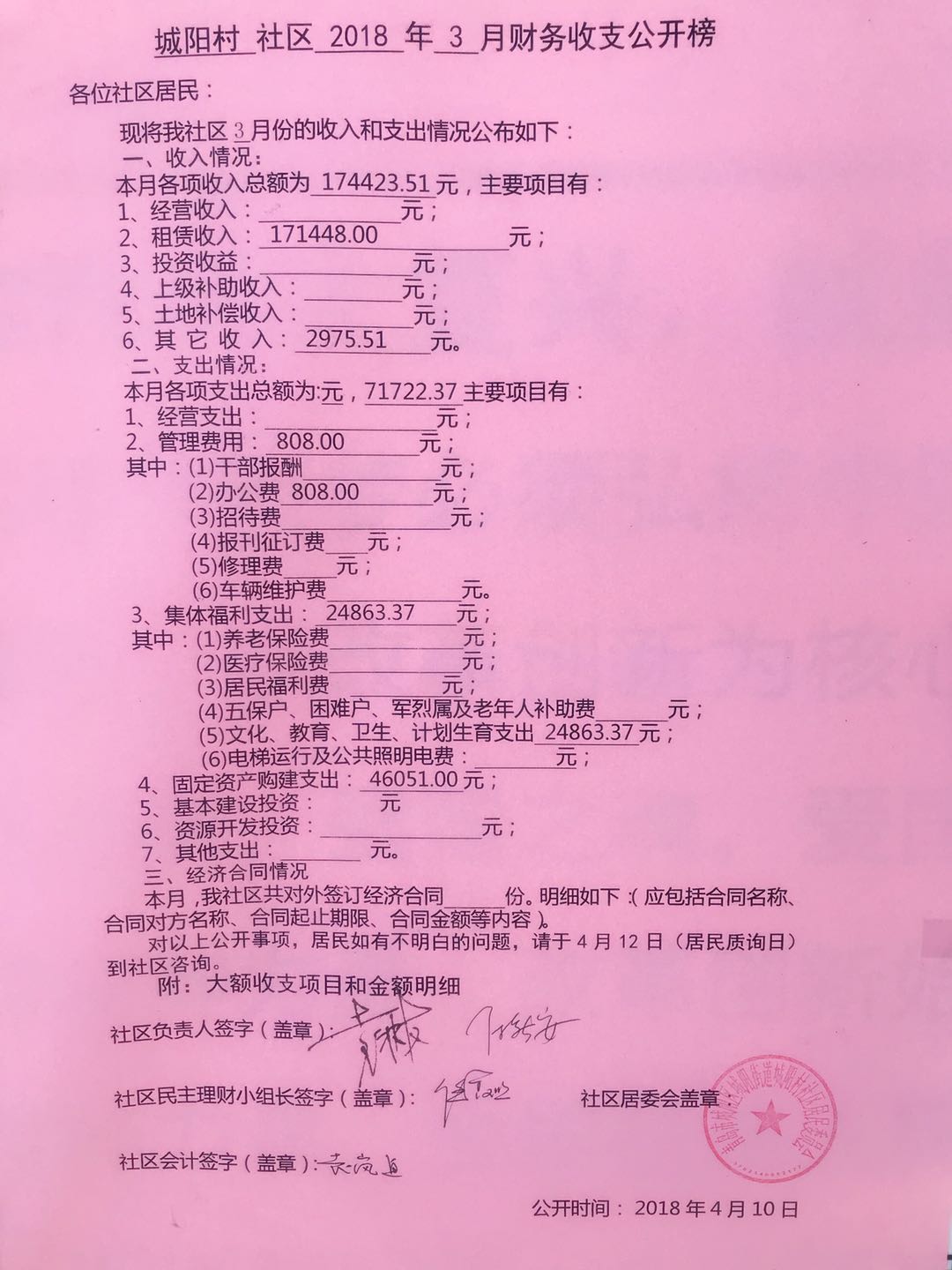 城阳村社区2018年3月份财务公开