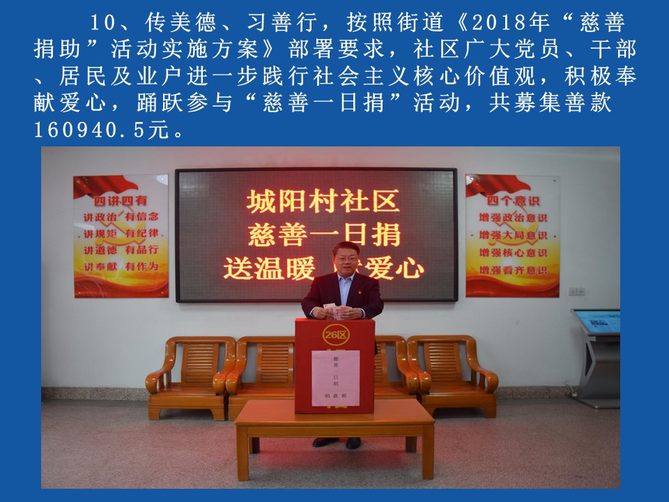 十一、社区出资人民币贰拾陆万元(26万元),倡导文明祭祀,告别陈旧祭祀陋习,在“清明节”、“十月一”、“春节”三个祭祀日期间,为社区居民免费提供鲜花,供缅怀、祭祀故人使用。