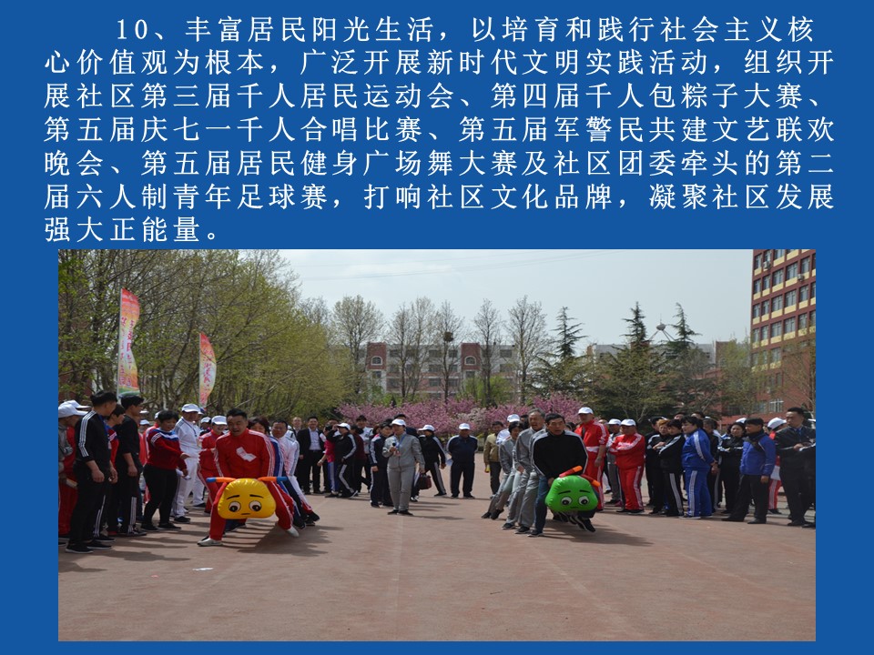 十四、社区出资人民币壹佰万元(100万元),举办社区第三届千人居民运动会,第四届千人包粽子大赛,第五届庆“七一”千人合唱比赛,第五届军警民共建文艺联欢晚会,第五届居民健身广场舞大赛及第二届六人制青年足球赛等多场大型文化体育活动。