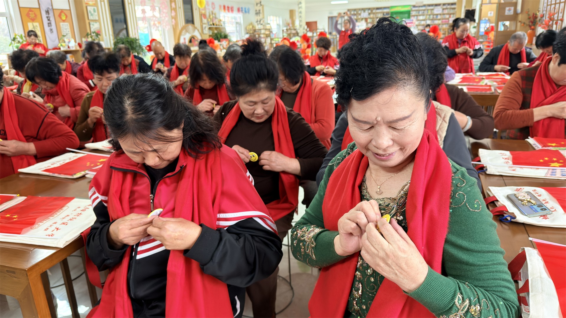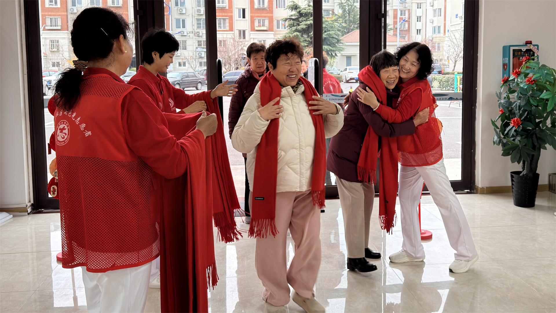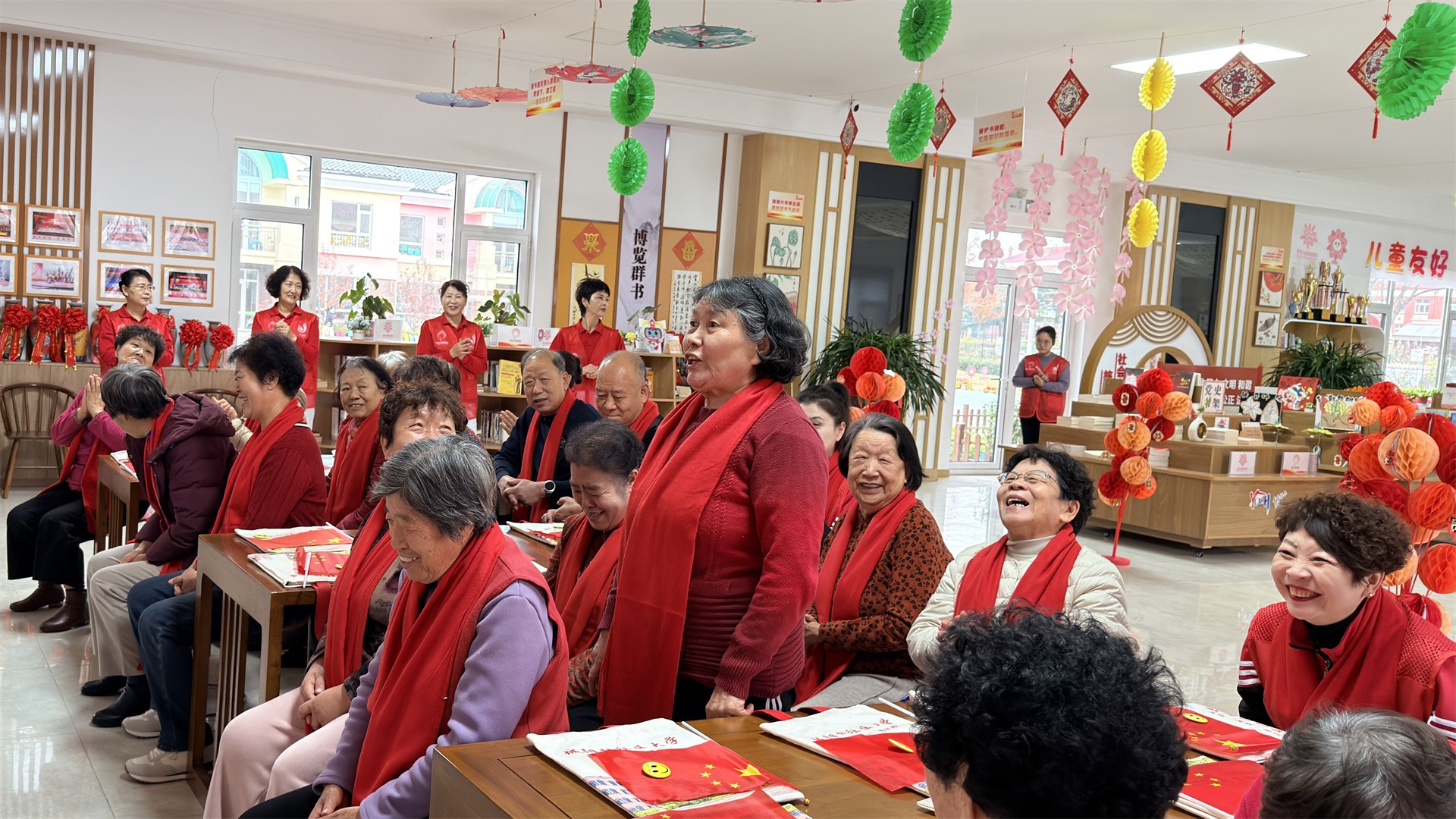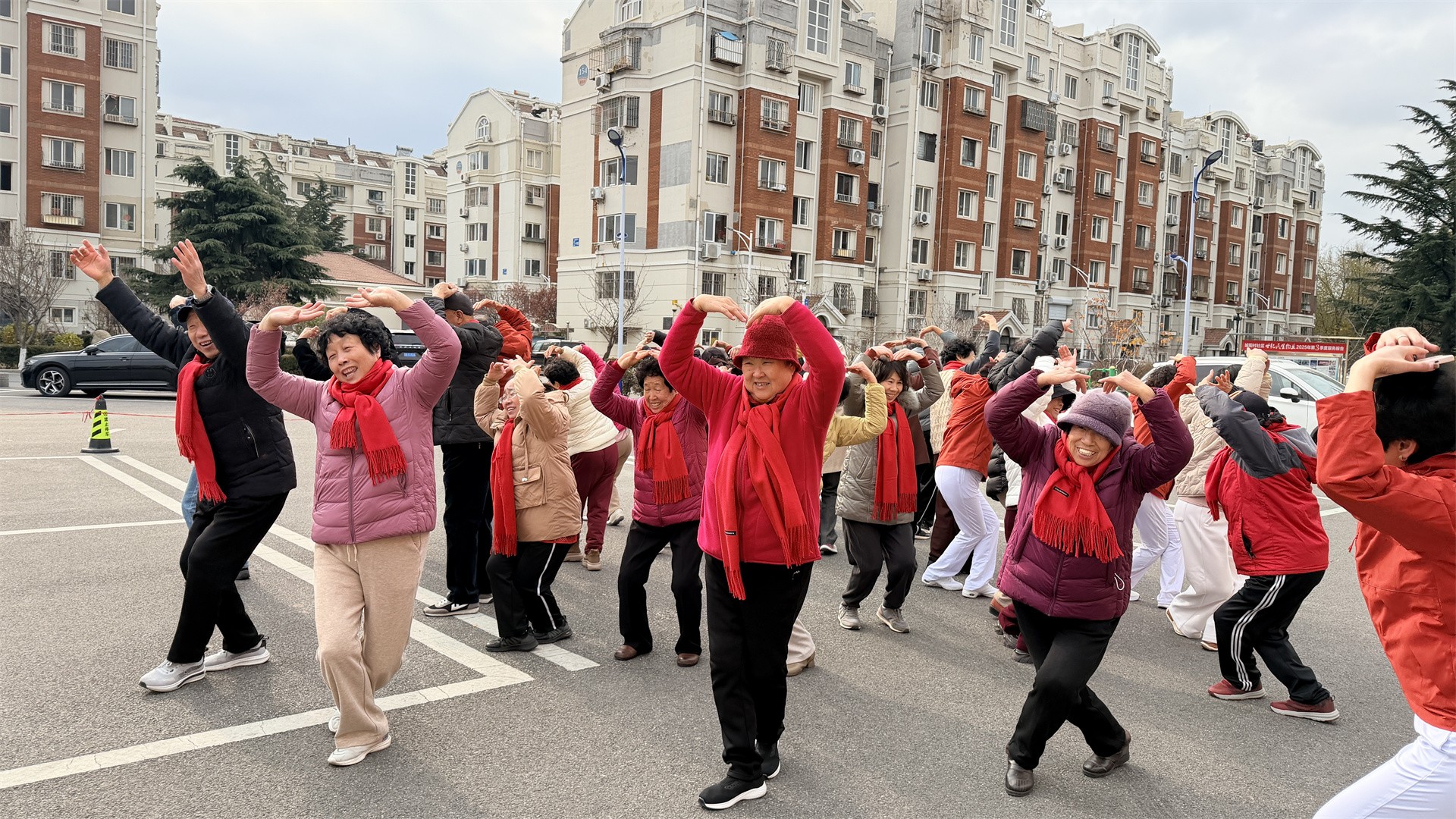 活动伊始,全体居民肃立,奏唱国歌,激昂的旋律中凝聚起奋进的力量;随后,大家挥动手中的国旗,齐声高唱《没有共产党就没有新中国》,歌声响亮,传递出对党的深厚感情和感恩之心。轻松互动环节里,居民们跟着志愿者的节奏练习了拍拍手、拍拍肩、找朋友等小游戏,简单的动作既舒缓身心,又增进了居民之间的默契;室外的拍打操活动,也让居民们在轻松愉快的氛围中掌握了简单实用的养生技巧。最后,学员们共同观看学习了马钧老师的视频授课《人生要有好老师》。