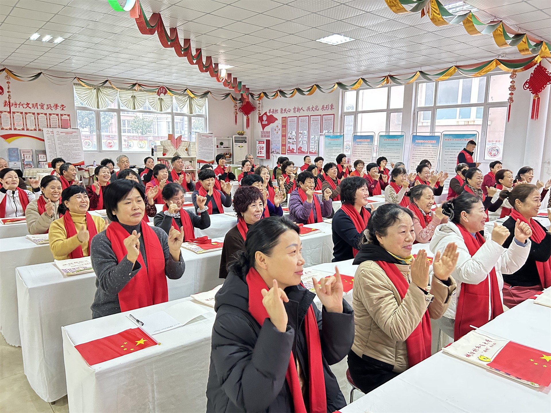 课堂中,在志愿者的带领下,居民们挥动双手、热情参与,一起做“五福手指游戏”,在简单有趣的互动中,充分调动起学员们的学习热情。社区志愿者带来互动舞蹈《幸福加加油》《站在草原望北京》,展现出社区居民其乐融融的和谐图景,以饱满的热情表达了对祖国的热爱与祝福。全体人员齐声高唱《没有共产党就没有新中国》,并庄重奏唱国歌《义勇军进行曲》,爱国情怀在每个人心中升腾。课堂上传统文化课程,内容通俗易懂,居民们认真聆听,收获满满。
