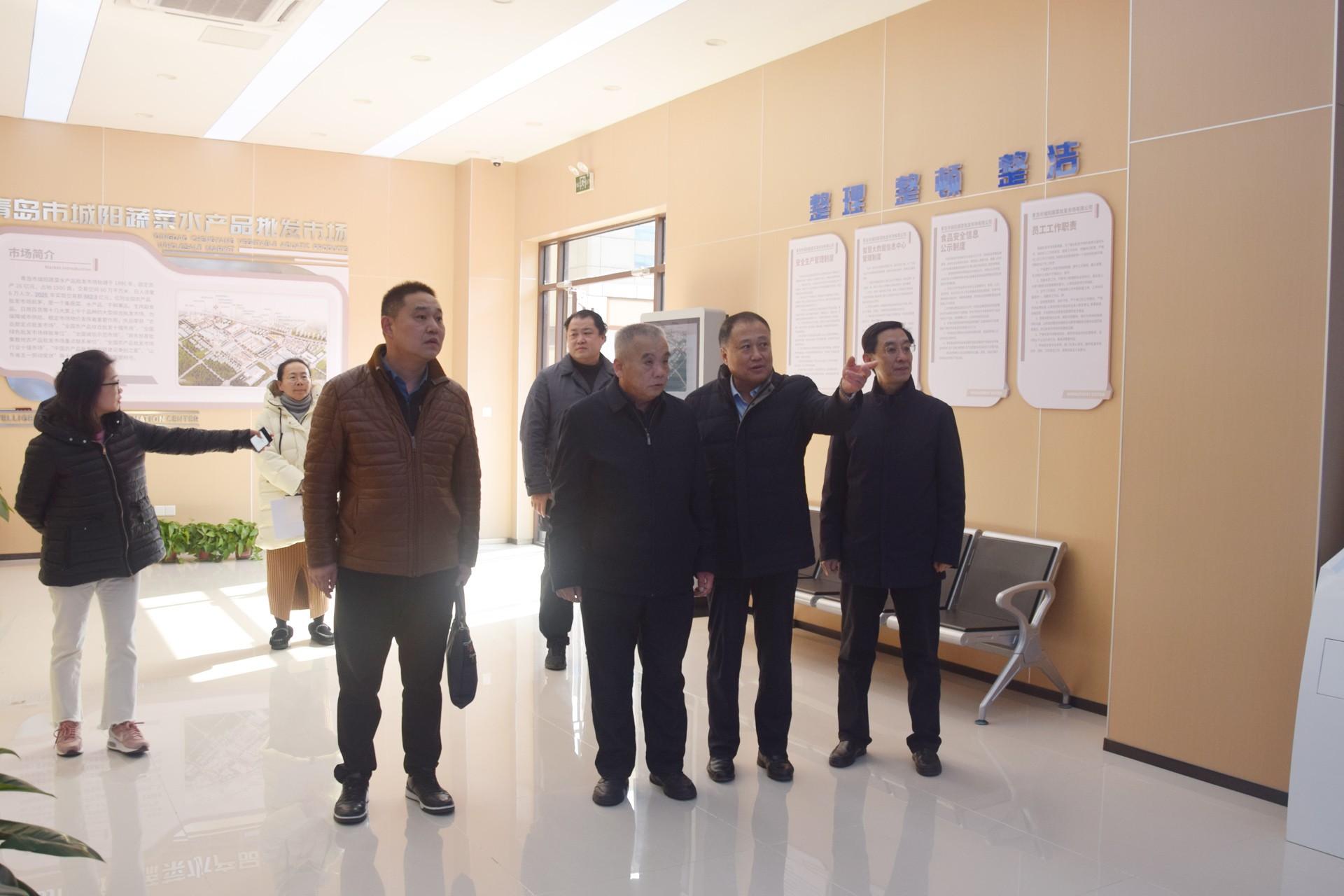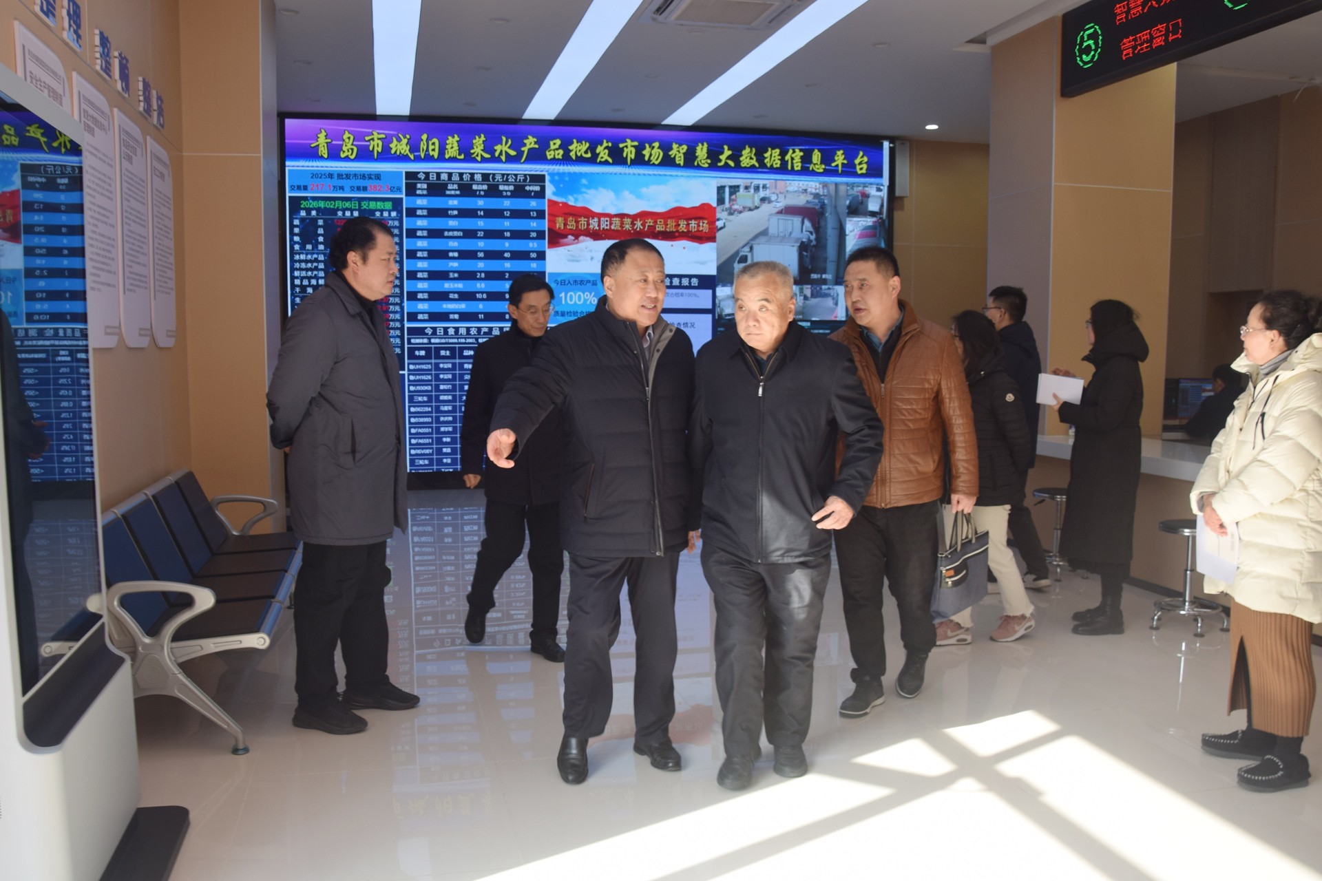 2026年2月6日上午,山东省价格认证中心三级调研员梁照龙、副主任刘军、三级主任科员孙韵、办公室负责人余标,青岛市价格认证和监测中心五级职员吴克新、科长宋佳、科员付迅雪等一行莅临城阳批发市场调研市场价格运行情况。城阳区发展和改革局二级调研员曹延海,城阳批发市场副董事长、总经理宫相军,批发市场副总经理、水产经营区域总经理袁秩宝,批发市场副总经理、商贸经营区域总经理袁永星陪同参加。