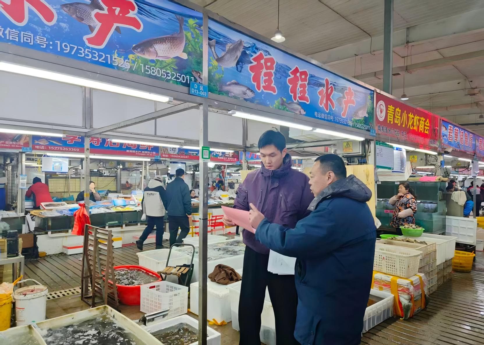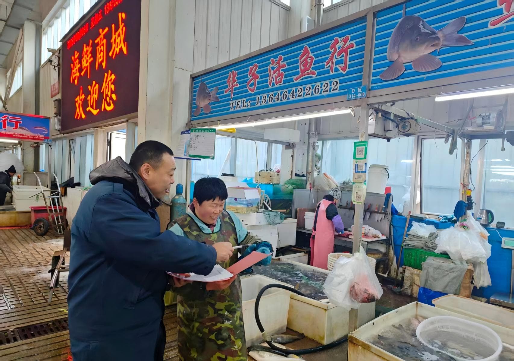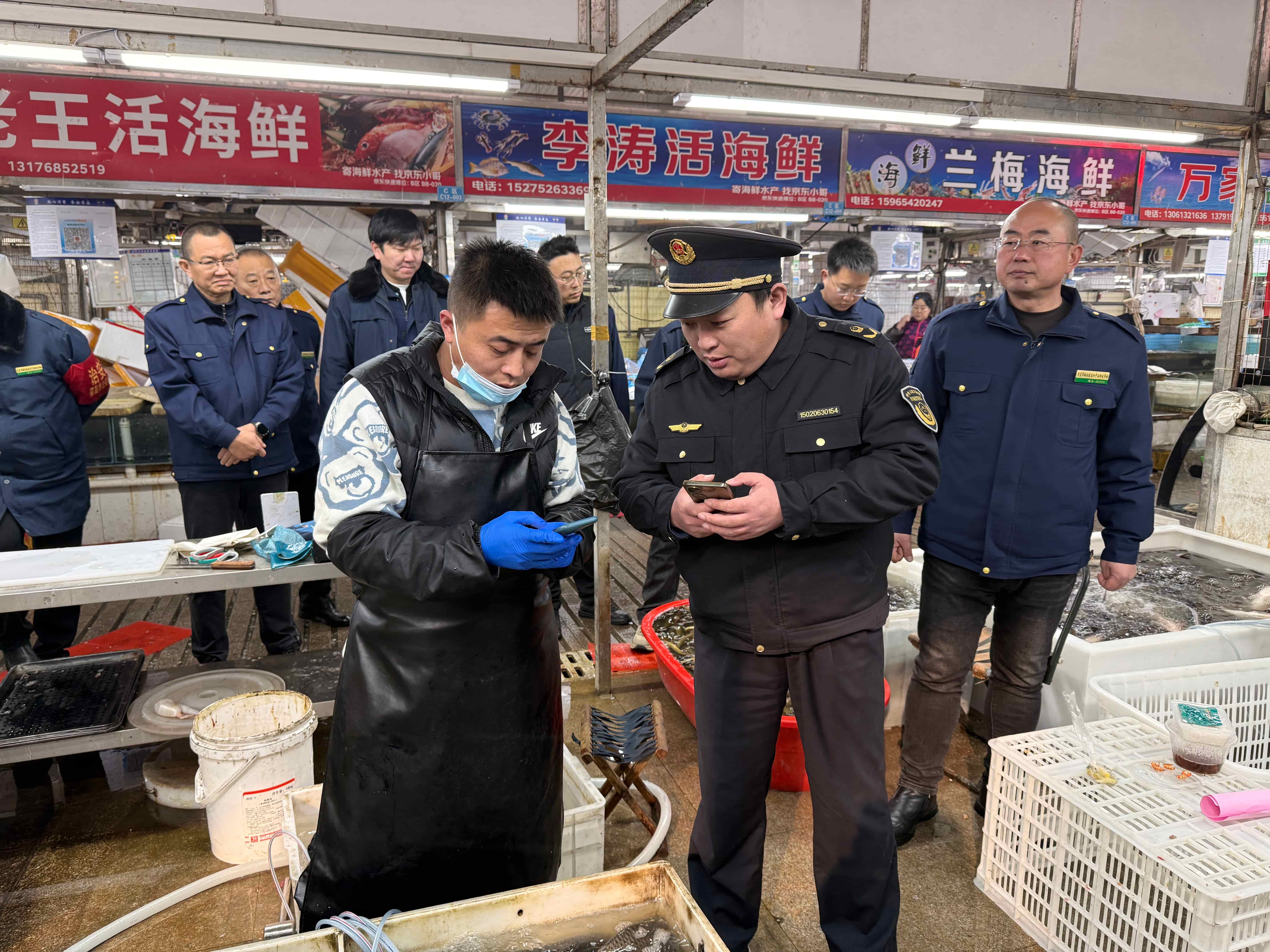 结合春节前消费特点,区域协助市场监督管理所对活鱼宰杀网点电子秤进行校验,逐一查看电子秤合格检验贴及“一秤一码”二维码张贴情况,从源头杜绝缺斤少两等欺诈行为;同时,检查海鲜商城电子秤配备与使用情况,对海鲜商城“皮筋捆绑”销售行为、冷冻食品安全开展排查,切实保障消费者合法权益。