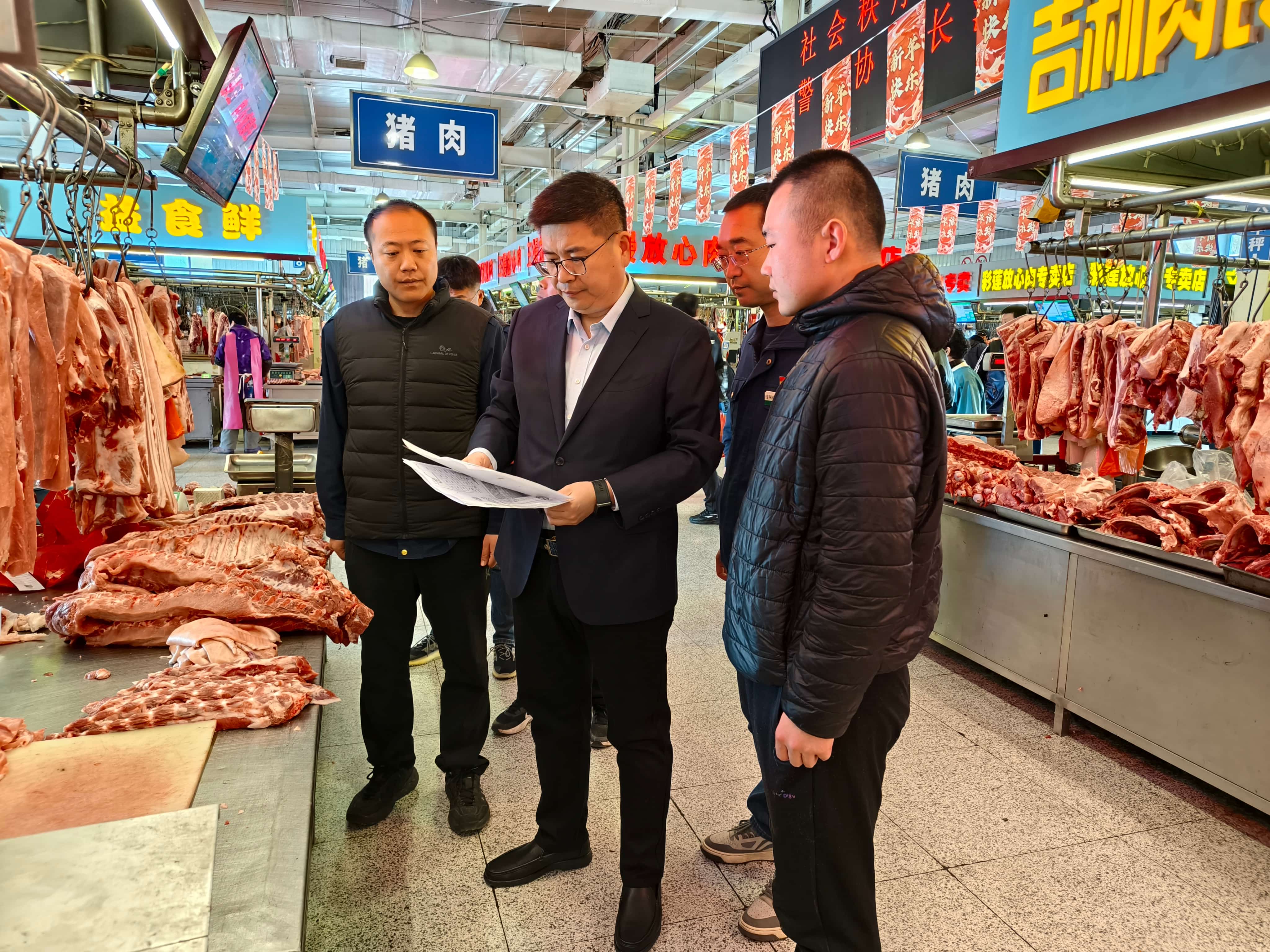 聚焦生鲜肉产品交易特点开展夜间联合检查,逐项核查经营业户证照是否齐全有效、进货渠道是否合法正规,重点查验动物检疫合格证明、肉品品质检验合格证是否完备,核对票据信息与现场肉品是否一致,严防不合格肉品流入市场。